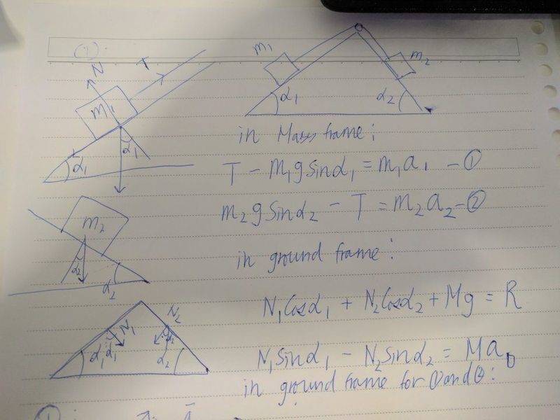 A triangular prism of mass M is placed one side on a frictionless horizontal plane as shown in Fig. 1. The other two sides are inclined with respect to the plane at angles a1 and