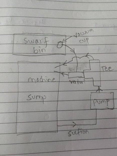 Now the problem with this system is that it is dedicated to each machine, where pressurized coolant passes through the venturi from the pump (motive) and creates a suction through which coolant is sucked from the swarf trolley. Coolant that passes through the venturi is returned to the sump. A schematic is attached for reference.