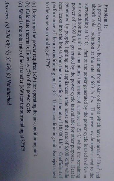 The discussion centers around the calculation of the coefficient of performance (COP) in a power cycle receiving heat input from solar collectors. The initial calculation presented was COP = Qin/Wcycle = 650 J/m²s / Wcycle = 32.5 kW/Wcycle, leading to an incorrect Wcycle of 10.15 kW. Participants clarified that for cooling, the focus should be on heat removed (Qin), while for heating, it should be on heat supplied (Qout). The correct answer suggested was 14.13 kW, indicating a need for proper application of COP in thermal systems.