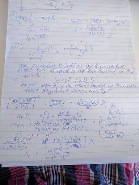 (ii) Determine how far the mass m slides along the surface of the cart before stopping on it. State explicitly any relevant laws or principles and any relevant approximations.