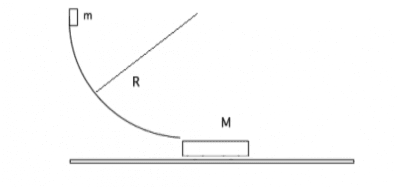 A small mass m slides without friction on a surface making a quarter-‐circle with radius R, as shown. Then it lands on the top surface of a cart, mass M, that slides without friction on a horizontal surface. (In practice, this cart could be a slider on an air-‐track.) Between the top of the cart and the mass m, the coefficient of kinetic friction is µk. The mass m slides a distance d along the top of the cart, but doesn't fall off. (i) When there is no longer any relative motion between m and M, how fast is the cart.Show all working and assumptions and state carefully and explicitly any relevant laws or principles. (Hint: you will find it helpful to break the problem up into separate stages and to draw diagram for each.