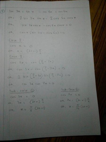 The discussion revolves around finding the general solution of the trigonometric equation $$\sin {3x}+\sin {x}=\cos {6x}+\cos {4x}$$. Participants are examining various solutions and identities related to trigonometric functions.