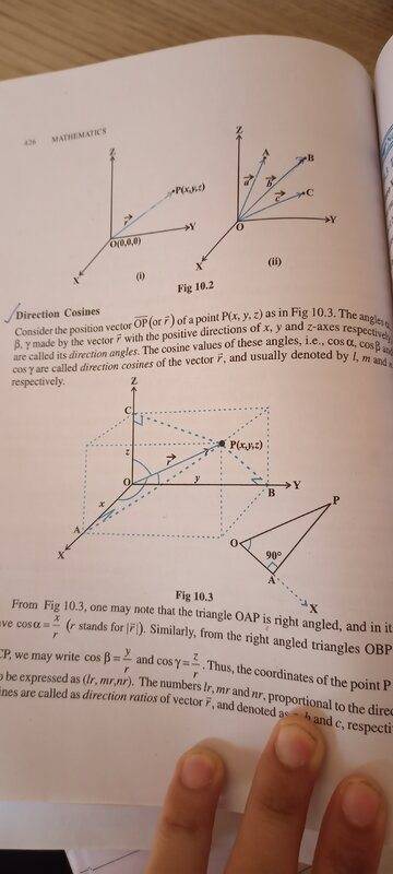 - Another participant clarifies that angles AOB, AOC, and BOC are right angles due to the orthogonality of the unit vectors OA, OB, and OC, suggesting that triangle OAP is right-angled based on its geometric configuration.
