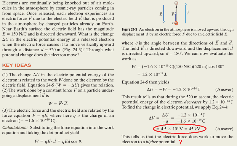 I do understand why the change in the electric potential energy of the electron is negative, because the electron tends to move upwards by its own to decrease its potential energy, right? But I don't understand why the textbook says the change in electric potential is positive and the electron moves to a higher potential? The electric field is pointed downward so naturally, the electron tends to move upward to decrease its potential energy. So at higher altitudes, the potential must be lower, not higher...?