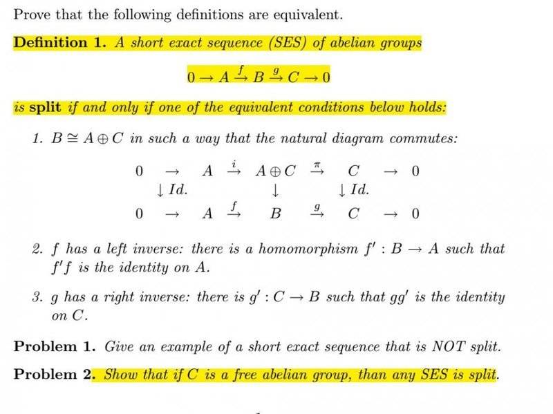- Some participants inquire about the definitions of a split sequence and a free Abelian group, suggesting that these definitions are crucial for understanding the problem.