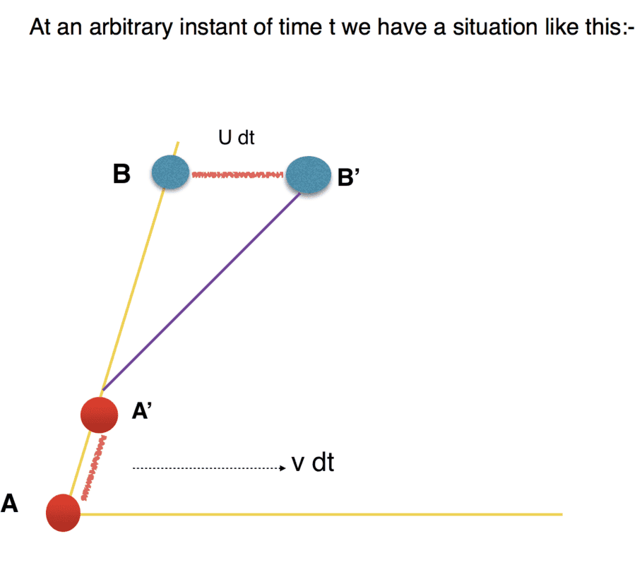 As the time passes velocity vector v would gradually change from fully vertical to fully horizontal in order to meet point B. Now, at any instant of time we have x-component of v as v cosθ and y-component as v sinθ. To catch point B our point A has to travel a distance of l in y- direction and to catch it in x-direction it has to cover the same distance as point B has covered. So, let's assume that they meet at time t , then