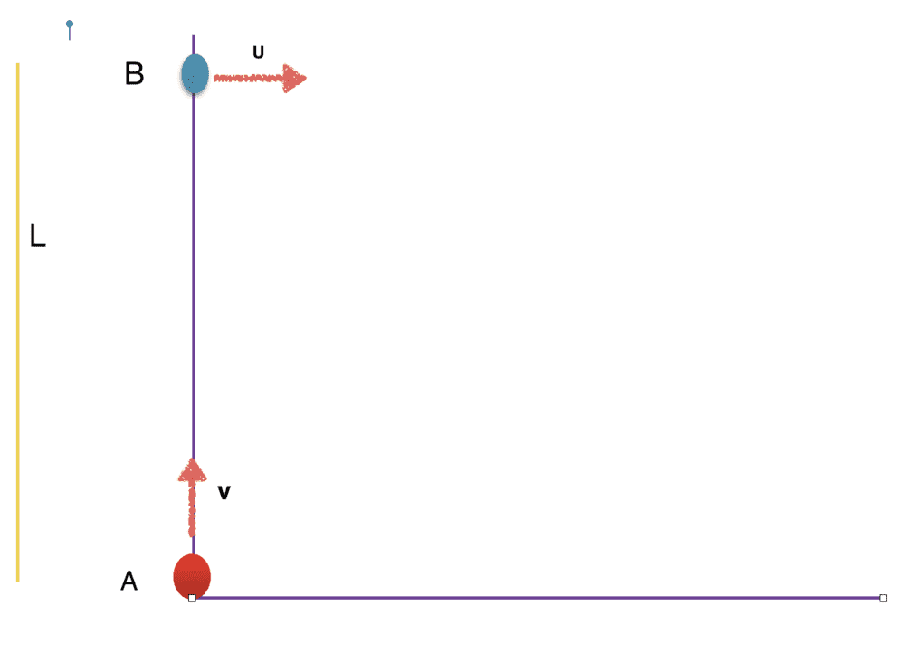 - Point A moves uniformly with velocity v so that the vector v is continually "aimed" at point B which in its turn moves rectilinearly and uniformly with velocity u<v. At the initial moment of time v is perpendicular to u and the points are separated by a distance l. How soon will the points converge ?
