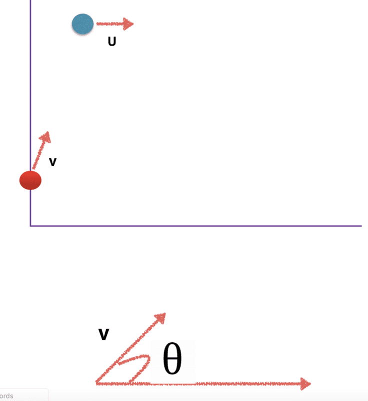 The statement "at the initial moment of time v ⊥ u and the points are separated by a distance l " gives us a picture like the one which I have added in attachment.