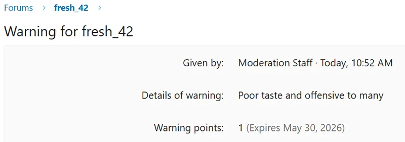 If I am warned for a too poor taste for PF and being offensive too often, by the way, what have been the other occasions(?), if there have been so many, then please list a few so I could see them(!), and, please note that I cannot see deleted posts as moderators can, then there is only one possible conclusion that can be drawn.