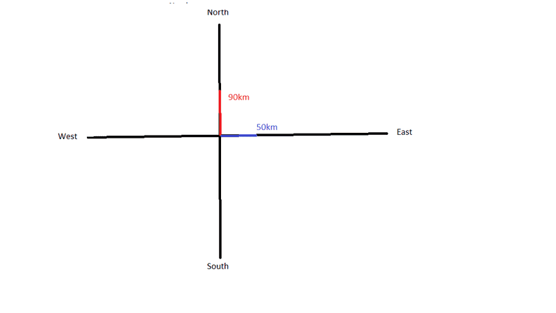 A sailboat sets out from the U.S. side of Lake Erie for a point on the Canadian side, 90.0 km due north. The sailor, however, ends up 50.0 km due east of the starting point. (a) How far, and (b) in what direction must the sailor now sail to reach the original destination?