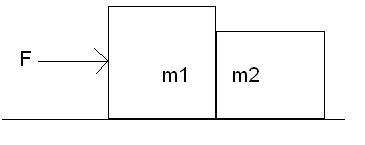 Suppose we have two rectangular blocks (masses m1 and m2) at rest on a frictionless flat table. They are in contact. Block 1 is on the left. We apply a force F to block m1. (Positive is to the right.) What is the equation relating the applied force, F, and the acceleration, a?