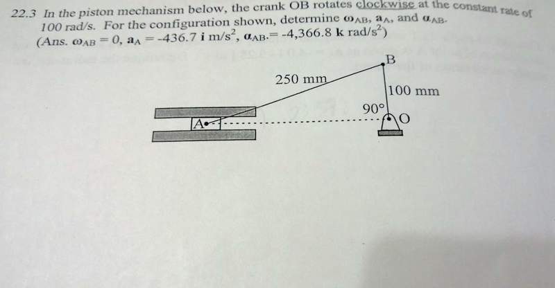 First, I got the relative positions (Rob and Rab) of O with respect to B (-0.1 j) and A with respect to B (-0.229i - 0.1j) I feel pretty good about this being correct