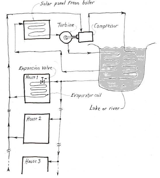 4. The cooled, low-pressure Freon is sent back to the solar panel inlet.