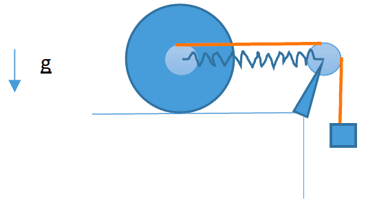 - A rope is wound around the axis orthogonal to a disk of mass ##M## and radius ##R## and there is a mass ##m## hanging from this rope as shown in the figure. The disk rests on a horizontal plane and connected to its center there is a spring which has its other second end fixed on a pulley.