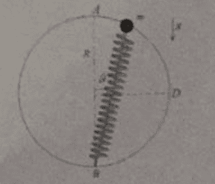 A point mass ## m ## connected to a spring is bounded to move on a circular guide with radius ## R ## without friction. The guide is fixed to a vertical plane and the other extremity of the spring is attached at point ## B ##, which is the bottom of the guide. The rest length of the spring is ## 2 R ##. Initially the mass is in the point ## A ## and at ## t = 0 ## it begins to move with a negligible velocity