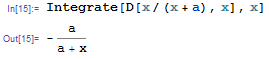 I have just encountered a strange (for me) inconsistency with a derivative: If I take the x derivative of ##\frac{x}{x+a}## I get ##\frac{x+a-x}{(x+a)^2} = \frac{a}{(x+a)^2}##. However, when I take the integral of the latter I get: ##-\frac{a}{x+a} (+constant) ≠ \frac{x}{x+a}##. I have checked the above (simple) calculations with Mathematica to make sure I didn't make any mistake with formulas/arithmetic. Maybe I forget some principle but how is it possible to integrate the derivative of a function and get something else than the function itself back?