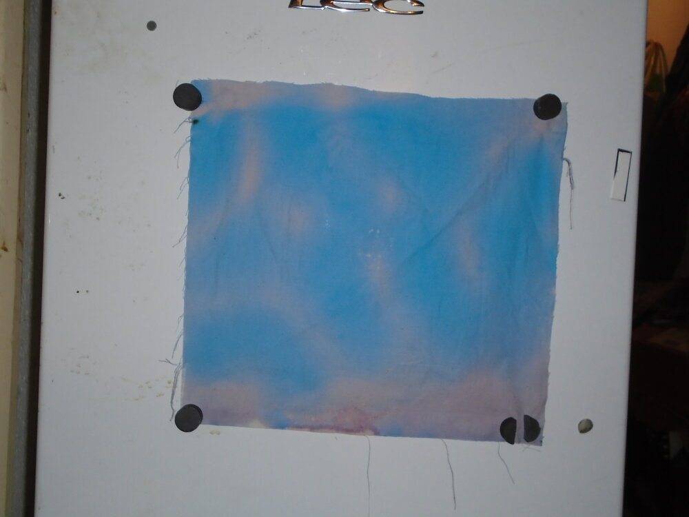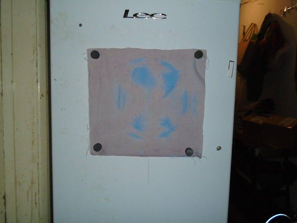 I then removed the glass plate and its support from the oven and wiped off any water condensation from the 6 surfaces of the oven before placing my bit of white cloth on the oven floor. I then gave it 30 seconds of full power. I then put the cloth on a fridge door and held it in place with ferrite magnets and took photo 1. I then repeated the whole operation but this time hung the cloth from the roof of the oven by holding it in place with 2 ferrite magnets.