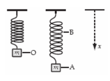 - A weight of mass m is at rest at O when suspended from a spring, as shown. When it is pulled down and released, it oscillates between positions A and B. Which statement about the system consisting of the spring and the mass is correct?