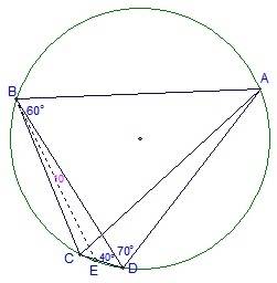 The discussion focuses on solving for the angle ∠DBC in quadrilateral ABCD, where sides AB and AC are equal, specifically given the angles ∠ABD = 60°, ∠ADB = 70°, and ∠BDC = 40°. Using the properties of isosceles triangles and the sum of angles in a triangle, the solution concludes that ∠DBC equals 50°. This conclusion is derived through geometric reasoning and angle relationships within the quadrilateral.
