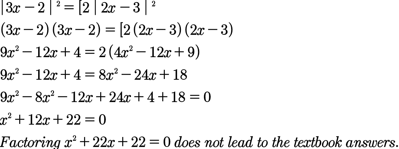 The discussion revolves around solving the absolute value equation |3x - 2|/|2x - 3| = 2. Participants explore different methods for finding solutions, including algebraic manipulation and squaring both sides of the equation. The conversation includes attempts to reconcile differing results with textbook answers.