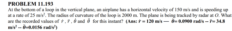 and the a in intrinsic coordinates (v˙t^+v2/ρn^) in our case I assumed that t^=i and n^=j and that assumption is correct because it got the r˙ right, then I got r^ and θ^ in terms of i and j and now we have 2 equations with 2 unknown. The problem is that it gets the answer wrong, I checked my numbers a trillion time, still can't get the answer, anyone have any idea what is wrong?