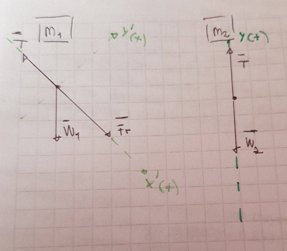 - The coefficient of static and dynamic friction are 0.45 and 0.3 respectively. Find the maximun value that ##m_2## could have so that the system is in equilibrium. Then, if ##m_2## is the double of the mass calculated previously, determine what's the acceleration of the system.