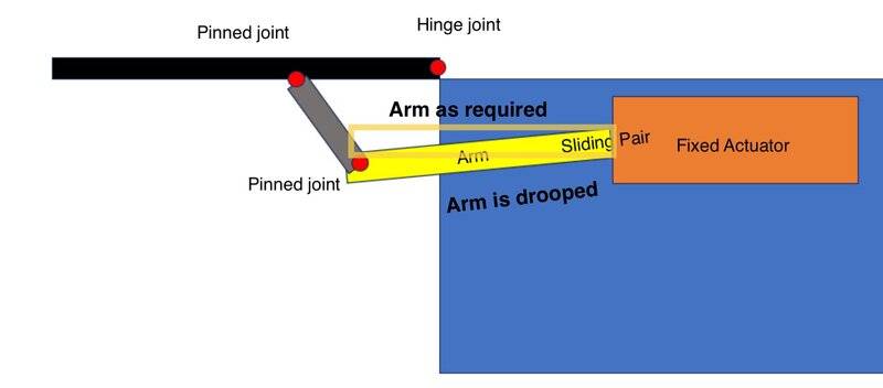 The discussion revolves around the issue of a linear actuator arm drooping under the load of a door it is designed to lift. Participants explore various mechanical configurations and solutions to mitigate the drooping effect when the actuator is fully extended and the door is horizontal. The conversation includes theoretical considerations, practical suggestions, and potential design modifications.