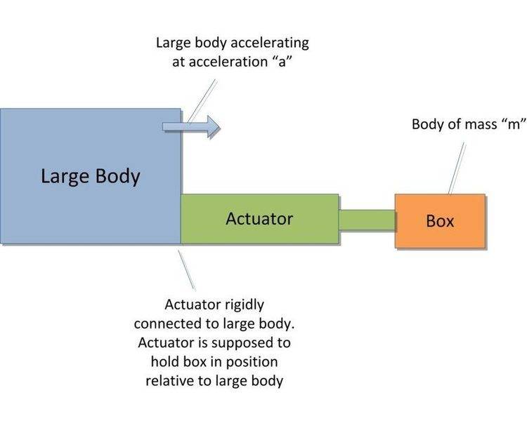 I am trying to size a linear actuator. Basically I have a large body that is accelerating at acceleration in x direction. I have a linear actuator aligned in the x direction that is rigidly attached to the large body on one end and the other end is touching a box. The actuator has to hold the box (mass m) in place relative to the large body.