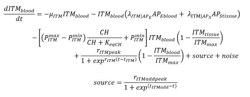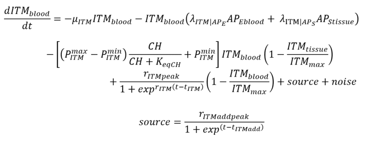 $$\frac{dITM_{blood}}{dt} = -\mu_{ITM} dITM_{blood} - \lambda_{ITM | AP_E} AP_{Eblood} ITM_{blood} + \frac{r_{ITMpeak}}{1+\exp[r_{ITM}(t-t_{ITM})]}\left(1 - \frac{ITM_{blood}}{ITM_{max}} \right) + S$$ where ##S = \mu_{ITM} ITM_{max} ##. That constant source term will cause ##ITM_{blood}## to reach equilibrium at ##ITM_{max}## where you will see flattening of the funky time-dependence. I'm not sure what you hope to accomplish with the inverse exponential source you added (also, why did you call that a sinusoidal term? that part was very confusing to me and I think it's just a matter of context). It's also not clear to me what the noise term would do for you. Can you elaborate?