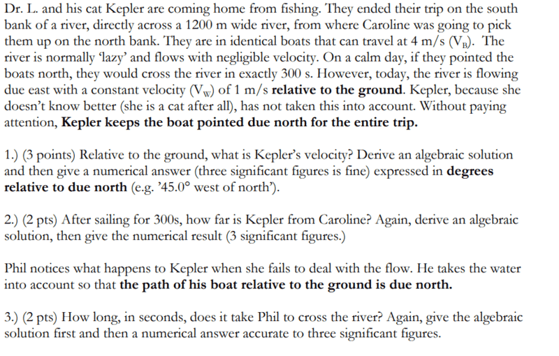 Problem: Dr. L and his cat Kepler are coming home from fishing. They ended their trip on the south bank of a river, directly across a 1200 m wide river, from where Caroline was going to pick them up on the north bank. They are in identical boats that can travel at 4 m/s (Vb). The river is normally 'lazy' and flows with negligible velocity. On a calm day, if they pointed the boats north, they would cross the river in exactly 300 s. However, today the river is flowing due east with a constant velocity (Vw) of 1 m/s relative to the ground. Kepler, keeps the boat pointed due north for the entire trip.