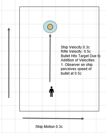 Note that in this case, the bullet and the observer have perpendicular velocities in the ship's frame. But, the ship and the bullet do not have perpendicular velocities in the observer frame.
