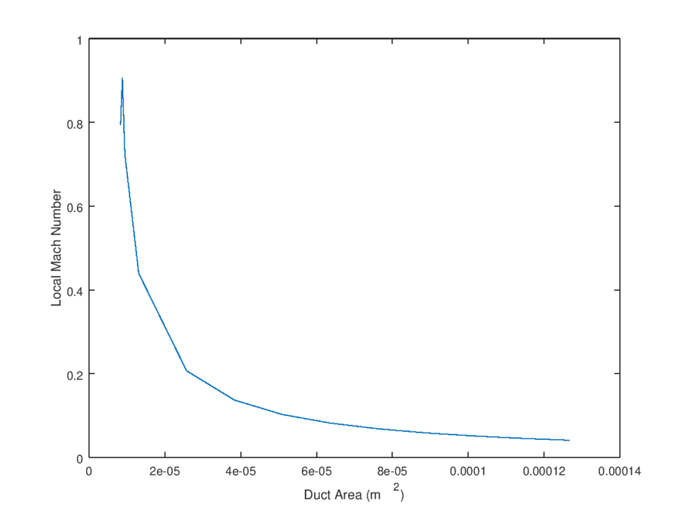 Now, the argument I see in the textbooks is that when a flow gets accelerated to Mach 1, the left hand side of the above equation goes to zero, therefore ##dA=0##. The textbooks interpret this to mean that Mach 1 only ever occurs at the throat. I understand the argument on mathematical grounds. Originally, my physical intuition was that as the gas flows it compresses, and so the temperature rises. As the temperature rises, the speed of sound increases. As a result, the flow can only approach Mach 1 asymptotically, with the speed of sound and flow velocity increasing at almost equal rates. However, this does not agree with my numerical results.