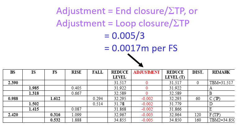 The discussion focuses on the adjustment calculations in levelling work, specifically comparing the adjustments for back-to-same-point levelling (TBM1) and known-to-different-point levelling. The formula for adjustment is established as (Bs - Fs) / number of points, while the end closure adjustment is calculated as end closure / number of TP. A critical point raised is the discrepancy in the number of turning points (TP) used in the adjustment for cases 392-394, where only 2 TP were present, yet the author divided by 3, leading to questions about the correctness of the adjustment method applied.