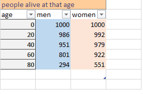 - I suppose the only sensible way to estimate this probability is to look at the number of dead men, between ages 60 - 80. The final two rows. The dead people between ages 40-60 would have contained too young dead people, who should not have been counted into the 20 year lifespan. (because many of their lifespans would have been shorter than 20 years required, I think this is the gist of the thing.).