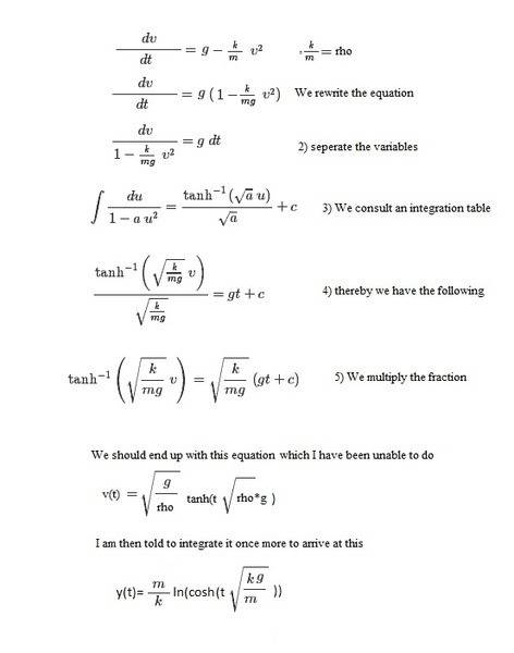 I would like to derive the air resistance equation showed in the attached photo. A little while ago, I tried asking at a different forum, however, the users were very experienced and omitted several stages of the derivation, and thereby made the interpretation difficult as I am new to math, but extremely eager to learn. I hope someone can help me illuminate each step of the derivation process, this would be a great help for my future studies, which are independent - I am not attending school at the moment. I have spent much time with this problem and I appreciate all help