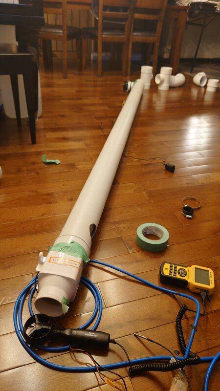 I am planning on building one from the top of my roof to nearly the floor, so ill say 5 feet. I am thinking of using a 1.5" inch aluminum tube, and bringing in 15CFM of fresh cold air per person, and the out pipe surrounding the in pipe will consequently be removing 15CFM. Assuming its just 20CFM for me and my puppy at the moment.