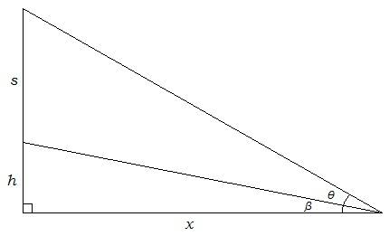 $$\tan(\theta)=\frac{sx}{x^2+h(h+s)}$$