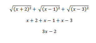 $$\sqrt{(x + 2)^2} + \sqrt{(x - 1)^2} + \sqrt{(x - 3)^2}, 1 < x < 3$$