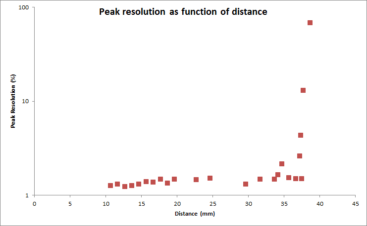 As the distance between the source and detector increased the FWHM got lower, but the peak resolution increased. I've calculated the peak resolution = (1/FWHM) * 100 and expressed it as a percentage.