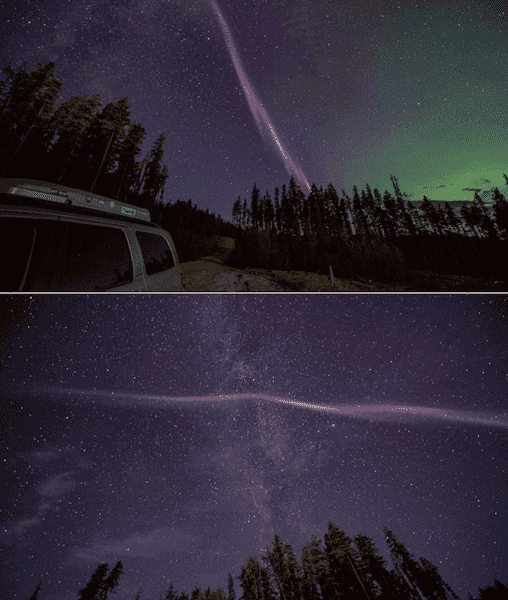 "As I was driving to the Kakwa river, I saw a purple 'proton arc' crossing the sky from east to west, pulsing and dancing with the Northern lights," says photographer Catalin Tapardel. "Quite a show..."