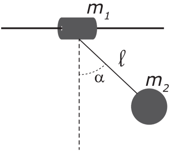 - Two bodies (see figure) are connected by an ideal rope of length ##l = 0.9 m##. The body with mass ##m_1 = 2 kg## is free to slide without friction along a rigid horizontal rod. The second body has mass ##m_2 = 3 kg##. The bodies are both initially stationary in the indicated position (##\alpha = 60 °##) when they are left free to move. Find: