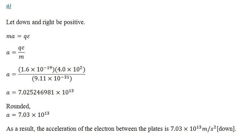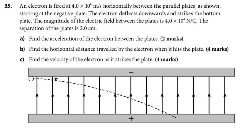 An electron is fired at 4.0x10^6 m/s horizontally between the parallel plates as shown, (see attachment) starting at the negative plate. The electron deflects downwards and strikes the bottom plate. The magnitude of the electric field between the plates is 4.0 x10^2 N/C. The separation of the plates is 2.0 cm