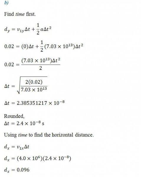 I'm using the equation, " V2^2 = V1^2 + 2a (d) " to find V2 however, I'm not too sure which "d" I should use, the distance between the 2 plates (2.0cm) or the distance I found for question B. Can someone give me an explanation as to which one I need to use and why?