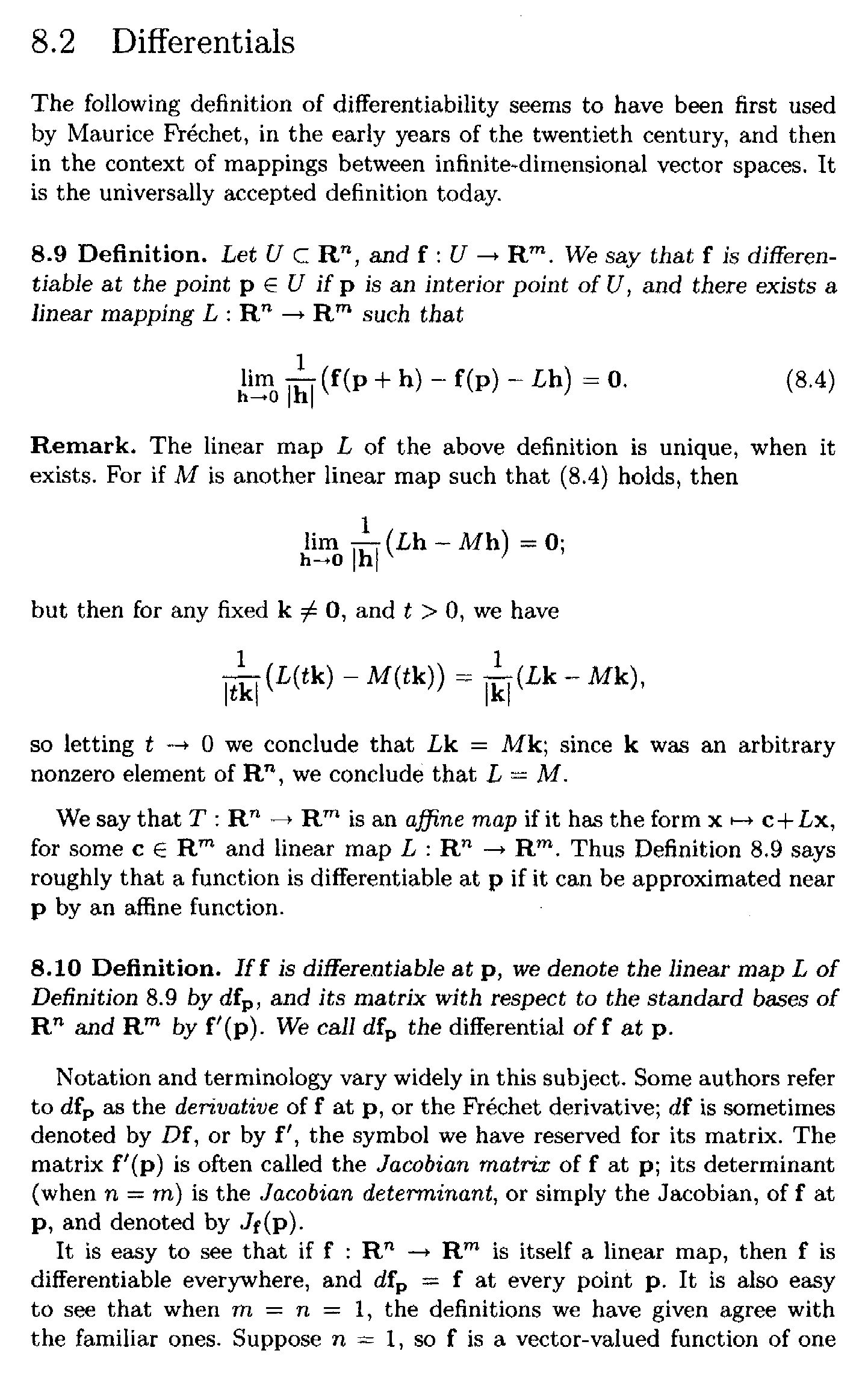 $$I wish to determine $$L = \text{df}_p$$ where $$p = (a, b)$$ using only Proposition 8.12 and the material in Section 8.2 preliminary to Proposition 8.12 (see scanned text at end of post) ... namely Definitions 8.9 and 8.10 and Proposition 8.11 ...I also wish to determine the Jacobian matrix of $$f$$ at $$p$$, namely, $$f'(p)$$ again using only Proposition 8.12 and the material in Section 8.2 preliminary to Proposition 8.12 (see scanned text at end of post) ... namely Definitions 8.9 and 8.10 and Proposition 8.11 ...I am unable to carry out the above without using partial derivatives ... which Browder has not introduced yet... indeed, it may not be possible ...