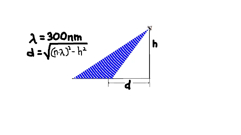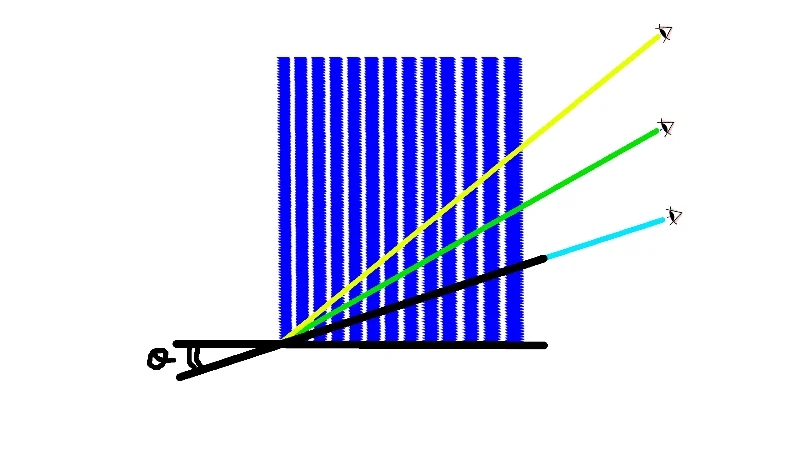 It is noted that a grating which similarly uniformly reflects light for a wavelength λ=600nm is simply scaled lengthwise, with similar scaling applied to the observer viewpoint.