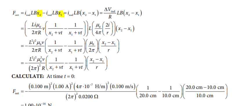 ##F_{net} = F_{right} - F_{left} = i_{ind} L B_{right} - i_{ind} L B_{left} ## where ##B= \frac{\mu_{0} i}{2\pi r}## and r is 0.1 for left and 0.2 for right and we substitute t = 0.
