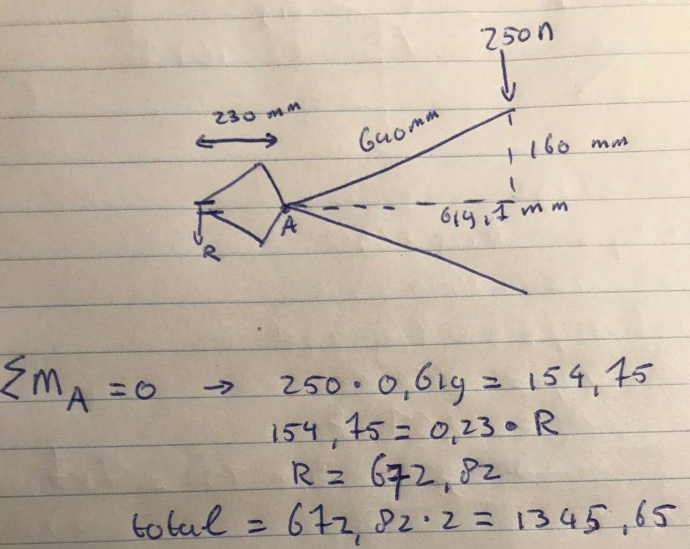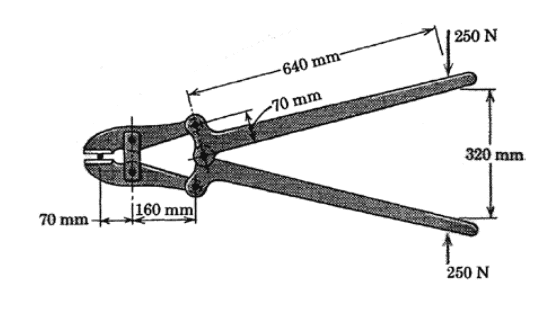 The discussion revolves around analyzing the cutting force of a bolt cutter, specifically focusing on the force generated in the small opening when a 250 N force is applied on both sides of the plier. Participants are exploring the mechanics involved in this force calculation.