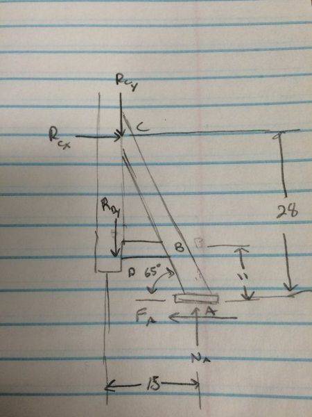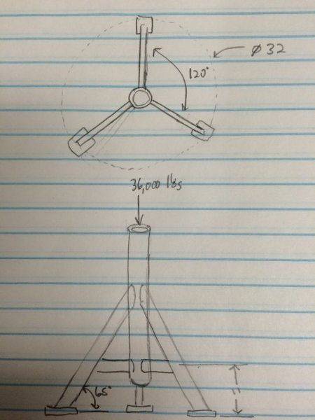 A jack-stand with three equally spaced legs (120 degrees) are connected to a center tube is loaded axially with 36,000 pounds. Each leg has a horizontal cross member 11 inches from the ground. All connections are welded. Set up FBD and find reaction forces.