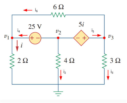 The KCL for the three nodes give you three equations, Ohm's law four and the two sources two. Nine equations in nine unknowns. Straightforward math to find e.g. ##v_2## first, then ##v_1## and ##v_3##.