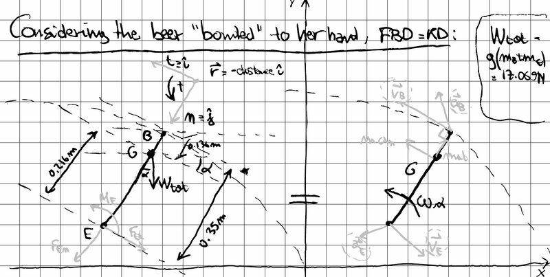 Hello guys, to analyse the above-described situation I have opted for considering the body "beer+lower arm" as a whole, therefore computing the new position of the COM for the correct FBD and equations of motion.